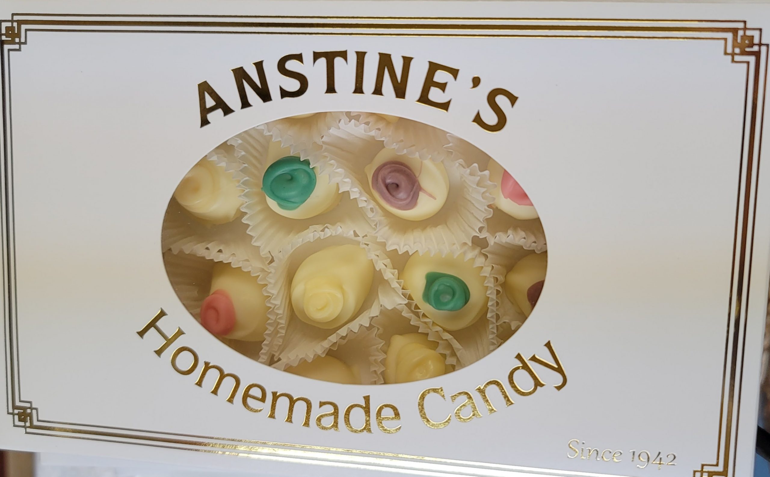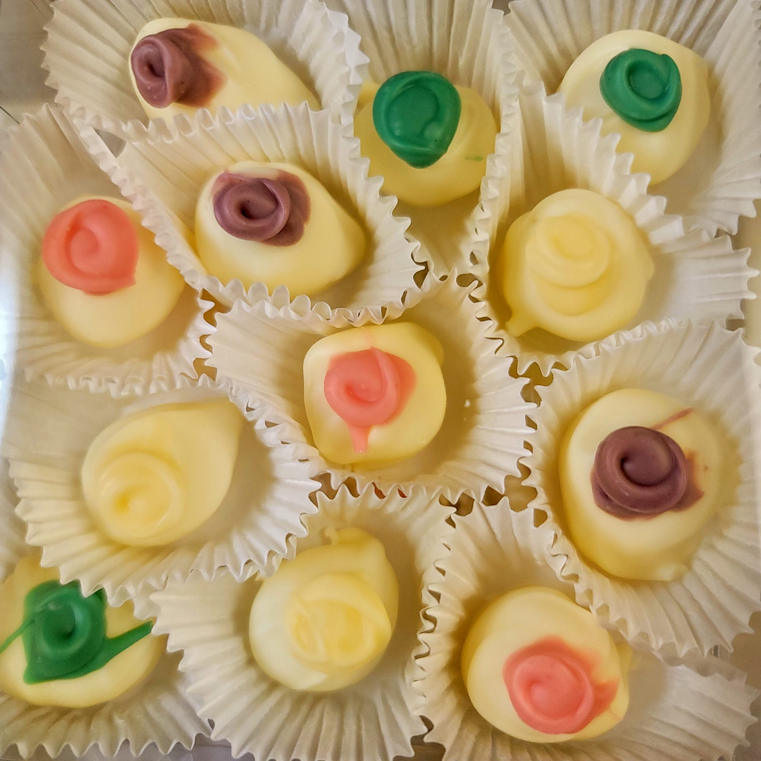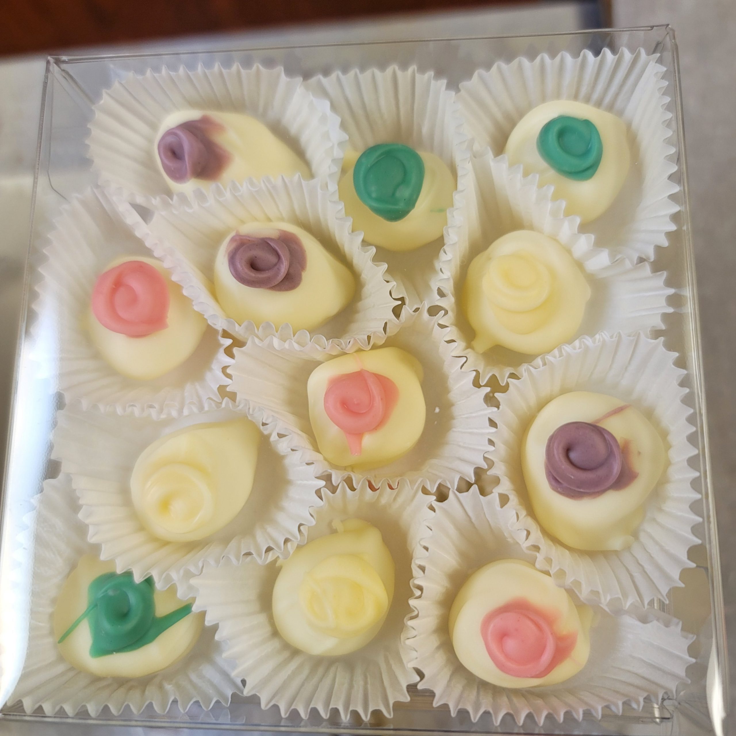 Our 50 Count (approximately One Pound) of Rosettes is Perfect for any Tea or Luncheon. Each Soft Pure Peppermint Center is dipped in Our Famous White Chocolate, with it’s slighlty sweet Vanilla undertones. Next the Dipped Mint is topped with A Swirl of Color. Color Combinations vary as Colors are Created In House.